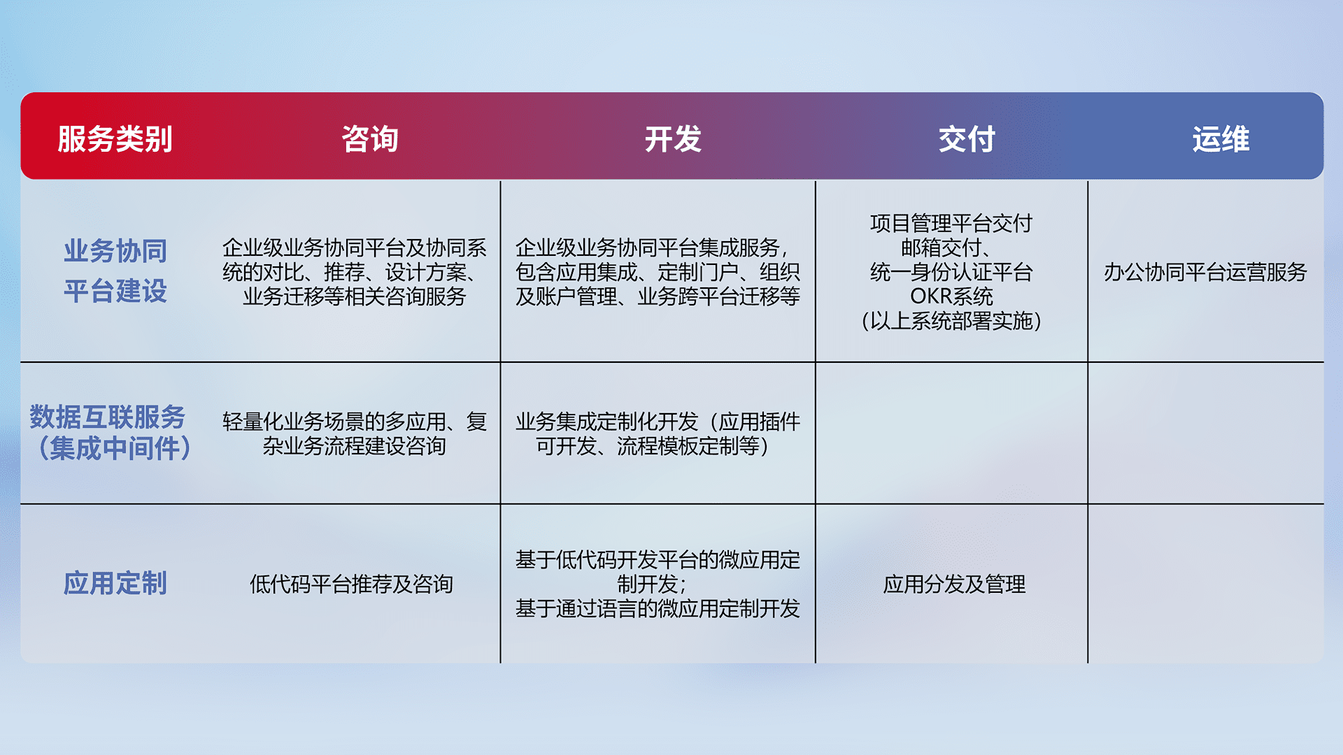 针对钉钉、、、、企微、、、IDaas等平台级产品提供产品的规划、、、方案、、、、交付、、、定制化开发等服务,,,实现如统一协同办公、、智能客户服务、、混合会议管理、、、智能数据查询、、、等业务场景,,实现数字化转型。。。。