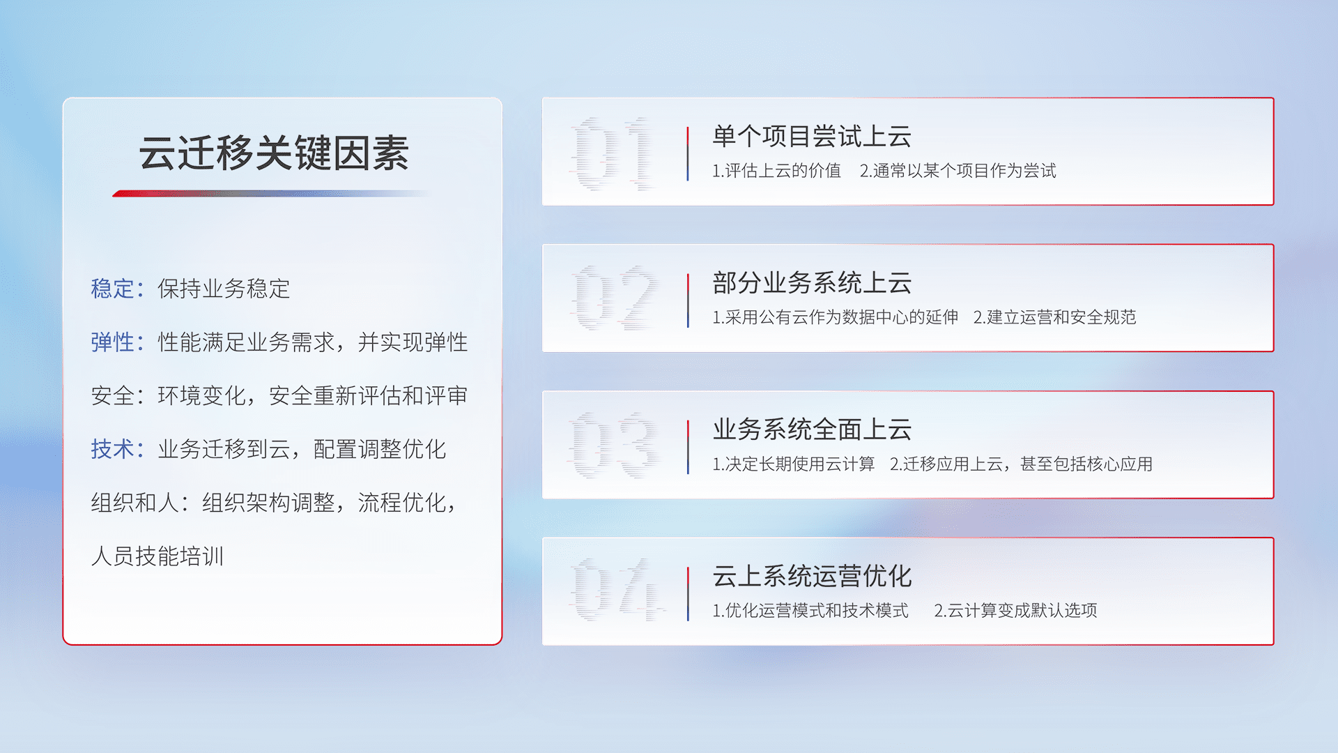 结合实际业务,,,从规划设计、、、、云平台选型、、、、云原生改造、、、、数据迁移、、、集成交付,,,,迁移全过程为客户识别最佳上云路径,,,做好风险识别管理,,设计网络架构、、、、身份权限、、、安全审计合规、、操作审计、、日志审计、、监控告警策略、、、、多站点容灾设计等,,,对云上基础设施进行整体规划,,,,提升IT治理水平,,,以满足弹性、、、高可用、、高性能的需求。。。