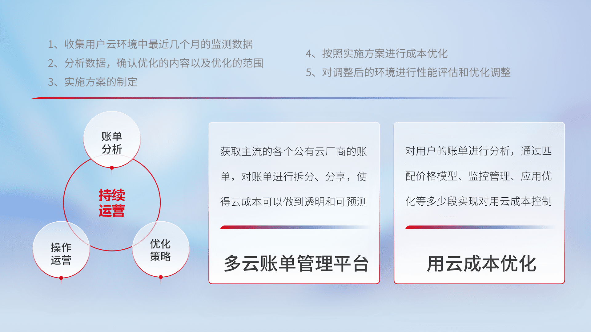通过多云纳管,,,以统一的资源数据模型把客户的云资源进行抽象和封装,,进而实现对多云资源的统一操作,,,,保障云资源管理的可靠性、、稳定性与可用性。。。。量身定制化运维内容,,,,配置、、开发运维、、补丁管理、、备份、、、、监控、、、认证和访问管理、、、、审计和日常巡检等,,保障在用云过程中的可靠度,,,,稳定度以及高可用率。。